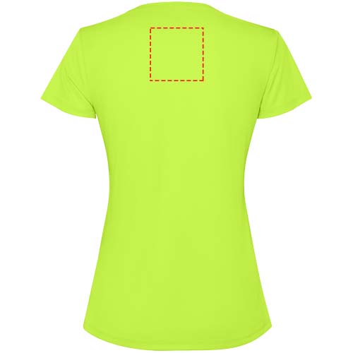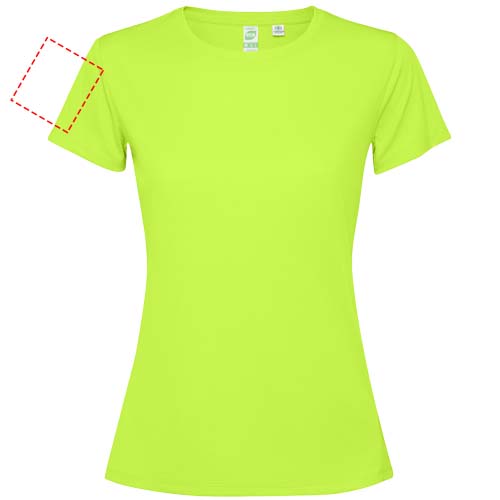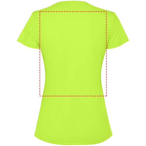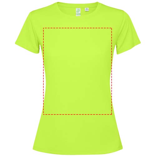 Getailleerd technisch T-shirt met korte mouwen voor dames. Kraag met bijpassende naden. De zoom aan de achterkant is iets langer dan aan de voorkant. Zijnaden naar voren verschoven.